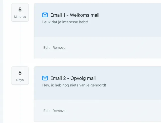 Geen leads meer bijhouden in Excel. Elke aanmelding wordt automatisch in je pijplijn geplaatst met Follow-up strategie. Laat die tijdwinst en sales maar komen!